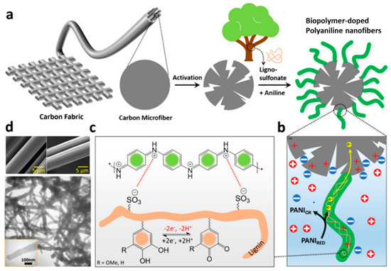 Wang et al. performed in situ oxidative polymerization of aniline with reticulated lignin, yielding polyaniline (PANI)/lignin composites possessing interpenetrating fibrous networks (Figure 9). [53]. In acidic solutions, aniline mostly forms cations, according to the polymerization mechanism. Because of its aromatic OH groups and CH2OH groups, lignin can be negatively charged in slightly acidic solutions. When combined, aniline cations can adsorb electrostatically onto the surface of lignin. Upon the introduction of ammonium persulfate (APS), aniline cations attached to the surface of reticulated lignin, which underwent oxidation to aniline cationic radicals, which reacted through radical polymerization to form PANI/lignin composites. These composites outperformed PANI itself as electrodes for supercapacitors, with respect to electrochemical capacitance, rate capability, and cycle stability. At 30 A g−1, the PANI/lignin composite provided a specific capacitance of 284.4 F g−1 and a capacitance retention of 58.6% when the current density was increased from 0.5 to 30 A g−1; for PANI these values were 123.1 F g−1 and 29.2%, respectively. Furthermore, at 1.0 A g−1, the capacity retention of the PANI/lignin symmetrical capacitor was 67.4% after 5000 cycles, outperforming PANI (17.8%).
