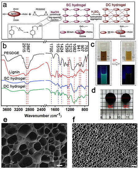 (a) Schematic representation of double-crosslinking reaction of DC lignin hydrogel through chemical crosslinking polymerization, followed by physical hydrophobic aggregation crosslinking. (b) FTIR spectra of poly(ethylene glycol) diglycidyl ether (PEGDGE), lignin, and the single-network (SC lignin hydrogel) and double-network (DC lignin hydrogel) lignin hydrogels. (c) Photographs of lignin in NaOH solution before and after treatment with H2SO4: (top) bright field images; (bottom) irradiated at 365 nm. (d) Photographs of the SC and DC lignin hydrogels. (e,f) SEM images of the (e) SC and (f) DC lignin hydrogels; scale bars: 20 µm. Reprinted with permission from ref. [86]. Copyright 2020 Elsevier.