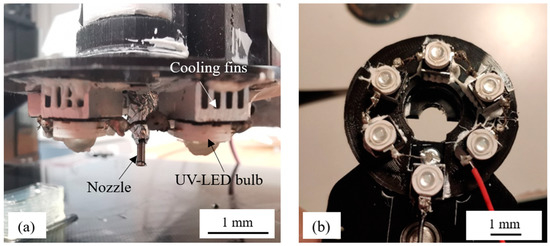 To provide the necessary irradiation for polymerization, six UV LED lights with the wavelength of 365–370 nm were fixed at the opening of the nozzle tip, as shown in Figure 1a. The lights were fixed on the aluminum cooling fins to dissipate the heat and the nozzle covered by aluminum foil to avoid light leakage. The distribution of the light has an overlapping region which is located at the nozzle tip. The light intensity was measured by radiometer which was set as 1 mW/cm2, as shown in Figure 1b, and was fixed during the whole process.