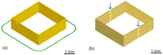 To find out the effects of the FS amount on the samples quality, a simple cube model was used and sliced with the software. The cube has both the length and the width of 30 mm, and the height of 10 mm together in 12 layers, as shown in Figure 2a.