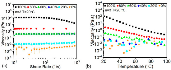 Oligomer ratio—related (a) shear thinning; (b) temperature dependent viscosity.