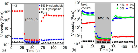 In our resin system, the hydrophobic FS was not a suitable agent since, after a short period of time, precipitation of a thin layer was formed at the bottom of the resin container. Moreover, the static viscosity was merely increased, which is similar to the addition of filler inside, as shown in Figure 4a.