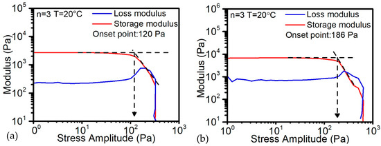 In order to prevent the shape distortion of objects with 3D geometries and the extrusion pressure, the yield stress of ink was investigated with increasing contents of the thixotropic agent for tracking potential changes in structural geometry after a fixed period of time. The results show that when the FS amount is lower than 5%, the ink still performs liquid status, which indicates that the loss modulus is higher than the storage modulus. When the FS amount arrived at 5%, from Figure 5a, the storage modulus reached 2800 Pa while the yield stress is 120 Pa. With the increasing of FS to 7%, the storage modulus increased to 6600 Pa and the yield stress increased to 186 Pa, as shown in Figure 5b. In this case, the higher amount of FS will raise the requirement of the extrusion stepper motor to extrude the material smoothly.