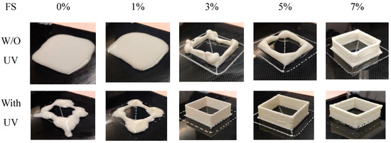 Figure 6 shows the printed samples of different solid compositions. From left to right, the FS amount gradually increased from 0% to 7%, respectively, and the ink with lower than 3 wt% loadings was insufficient to maintain the geometry of the part due to the relatively low elastic modulus. The ink is directly spread on the substrate. In the presence of UV light, the central part of the cube is discovered, while the pause originated from changing directions of the nozzles concentrated the major ink at the corner. With the addition of 3% of FS, several layers of the cube were generated, supported by its inherent strength; however, the disintegration occurs once, reaching about five layers. In the case of 5% FS loading, the shape of the cube is more clear, and once it reaches 7%, the pronounced and accurate structure of the cube is generated with a sharp edge that reflects the non-shear viscosity of a good condition for self-support. However, with the assistance of UV light, the cube can be printed in good condition since 3% of the FS. These results show that the combination of the extrusion—based printing and UV light enables the broadening of the process window.