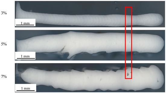 Meanwhile, the thickness of the wall is discovered to exhibit an obvious increase with the enhancement of FS content. Moreover, under different extrusion conditions, the thickness of the wall is enlarged in comparison with the original model. Table 3 shows the measured wall thickness at the center uniformed region by calipers. With three times measurement, it was shown that, when increasing the amount of FS, the wall thickness has an increasing tendency compared to the designed thickness. While the 3% FS is a little smaller than the designed 0.84 mm thickness, the 7% FS ink dramatically increases the thickness to 104% percent. This increment clearly decreases the printing accuracy of the part. The reason for the phenomenon is because the increment of FS increases the yield stress of the ink, which increases the die-swelling effect, and, due to the extruded extra volume of ink, the surface quality also decreased.