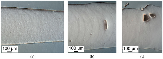 Since the clear differences appeared on the successfully printed cubes, optical microscopy images were taken to observe the differences from the 50× magnification structures, as shown in Figure 7. It is more obvious that, with the increase of the FS loading, the wall thickness is dramatically increased. Besides the wall thickness, the existence of voids and unfilled layer structures are observed due to the enhanced FS loading that increases the yield stress and related die-swelling effect. Whereas, the elevated yield stress requires higher pressure from the nozzle, which makes the shear rate near the critical point, leading to unstable printing. Because of the semi-curing status of the ink before contact with the UV light, there is still some time to let the ink flow on the printed surface. In this case, the cross section presents a smooth surface based on the fusion between different layers. The larger magnification image can be found in Figures S2–S4.