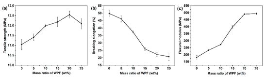 The mechanical properties of RPE/WPF composites with different WPF content: (a) tensile strength, (b) elongation at breaking, (c) flexural modulus.