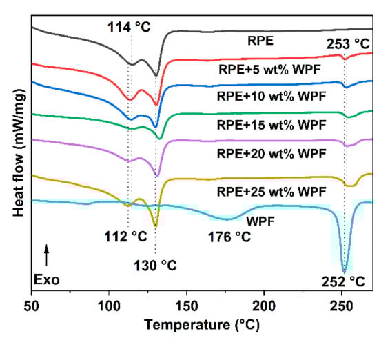 DSC curves of RPE, WPF and RPE/WPF composites with different WPF contents.