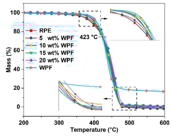 TG curves of RPE, WPF and RPE/WPF composites with different WPF contents.
