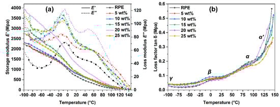 Storage modulus E′ (a), loss modulus E’’ (a) and loss factor tan δ (b) of RPE and RPE/WPF composites.