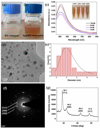 (a) Digital photograph of KS conjugate solution and (b) Ag@KS suspension, (c) UV–visible spectra of the AgNPs synthesized from various concentrations of AgNO3, the insert is a photograph of Ag@KS suspension at various AgNO3 concentrations, (d) TEM image of Ag@KS suspension at 10 mM AgNO3, (e) histogram representing the particle size distribution for 10 mM AgNO3 precursor, (f) SAED pattern, and (g) XRD spectrum of Ag@KS sponge.