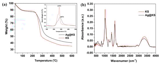 (a) Thermogravimetric profile of KS and Ag@KS sponge (derivative curve is inserted), (b) FTIR spectra of KS and Ag@KS sponge.