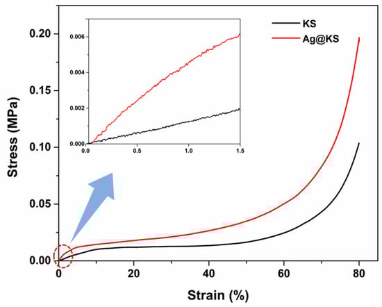 The compressive stress–strain curves of the KS and Ag@KS sponges (the initial linear region is inserted).