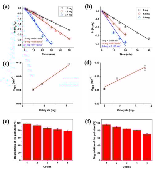 The pseudo-first-order kinetic curves of the catalytic reduction of (a) MB and (b) 4-NP, kapp values of (c) MB and (d) 4-NP under different Ag@KS concentrations; and degradation percentage of (e) MB and (f) 4-NP over five reduction cycles.