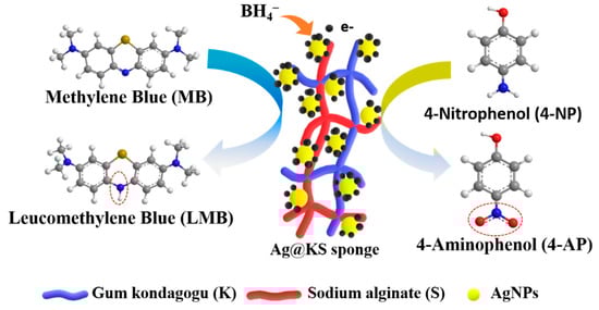 Proposed catalytic reduction mechanism of MB and 4-NP in the Ag@KS sponge network, using NaBH4.
