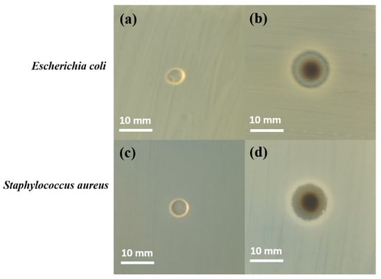 The antibacterial activity of KS and Ag@KS sponges were evaluated against Escherichia coli and Staphylococcus aureus by measuring the zone of inhibition of bacterial growth around discs placed on agar medium (Figure 8). Figure 8a,c show no inhibition zone around the KS sponge in both bacterial media. In contrast, the Ag@KS sponge showed a prominent zone of inhibition of diameter 11.2 mm ± 0.2 mm and 11.0 mm ± 0.2 mm, respectively, for Escherichia coli and Staphylococcus aureus, indicating excellent antibacterial activity (Figure 8b,d). AgNPs with a size of less than 10 nm have the ability to penetrate bacterial cell walls and subsequently change the structure and cause cell damage []. Overall, our findings indicate that AgNPs decorated on this sustainable sponge have a distinct inhibitory effect on the microbial growth of Staphylococcus aureus (Gram-positive) and Escherichia coli (Gram-negative), thus widening their applications in the environmental field [].
