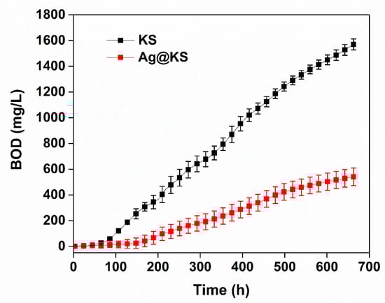 The biodegradability of the sponges was tested under aerobic conditions with an inoculum taken from WWTP. Figure 9 shows the biochemical oxygen demand (BOD) for KS and Ag@KS sponges. Aerobic microbial species disintegrate the sponges into smaller molecules during the degradation process through metabolic or enzymatic activities. In the case of the KS sponge, after the initial phase without BOD, the degradation profile goes linearly upwards. For Ag@KS, the reluctant phase is significantly longer (to around 150 h), and the slope of the degradation phase is also smaller. Hence, the KS degradation rate is higher than that of Ag@KS. After 28 days (672 h), the final BOD value for the KS sponge is 1566 ± 16 mg O2 L−1, while that for the Ag@KS sponge is 535 ± 35 mg O2 L−1. By comparing the weight loss, 90% of KS and 65% of Ag@KS were degraded in 28 days. The rapid deterioration of the KS sponge implies that the microorganisms present in the sludge could act on it faster, but the presence of AgNPs on the Ag@KS sponge slows down the activity of microorganisms in the material and thereby reduces the rate of degradation.