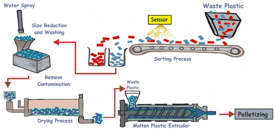 The mechanical recycling of plastic waste is secondary recycling; the most common method for recycling plastic waste. Mechanical recycling processes post-consumer plastics, to produce the raw materials for various plastic products []. In comparison, the recycling process depends on the chemical and physical properties of the waste plastic feed, in terms of its origin, composition, and form [,]. Figure 1 is related to the technology of recycling waste plastics by the mechanical method. Mechanical recycling includes several techniques, for instance, collection, separation, sorting, and washing []. The main objective of the waste plastic sorting process is to obtain high-quality recycled plastic goods, especially from a single polymer stream. Waste sorting technologies are based on various chemical-physical properties of the plastic, for instance, chemical compounds, size, color, and shape. Furthermore, the materials from post-consumer waste contain various polymeric materials and organic substances [,]. The subsequent process is size reduction. The typical process for size reduction involves cutting or shredding; nevertheless, this process depends on the type of plastic waste stream and plant layout. These processes may occur before or after the sorting stage [].