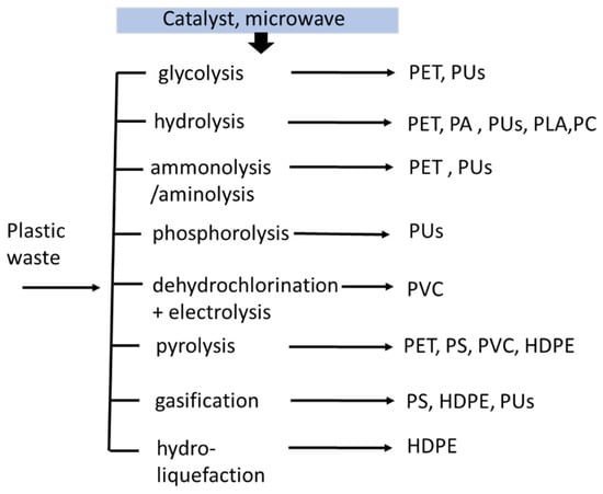 Tertiary or chemical recycling refers to the degradation of polymer bonds. As a result, the recovery of the oligomers monomers produces a smaller molecular weight. Hence, thermoplastic can be obtained with this method []. Some technologies can be applied in the following manner, as shown in Figure 2: