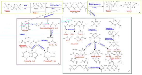 The depolymerization mechanism of polypropylene reaction: (A) hydrogenolysis into gas and liquid alkanes, (B) supercritical water depolymerization process, and (C) pyrolysis in a semi-batch reactor under atmospheric pressure [,,].