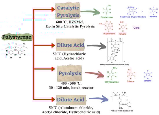 PS is difficult to degrade in natural environments. Nevertheless, chemical, mechanical, and thermal recycling are used to degrade the large molecule of PS. One of the methods for chemical recycling is dissolution. Figure 4 illustrates PS degradation by dissolution and a scheme of liquid products valuable in PS depolymerization, such as catalytic pyrolysis, dilute acid, and pyrolysis [,]. The polymeric components are first dissolved, then various processes are used to recover the solvent and polymer []. The recycling of foamed polymers by using solvents has several advantages. Filtration can be used to eliminate any insoluble impurities, leaving the polymer clean for any further treatment. Additionally, the dissolution process enables the separation of plastics from other waste and insoluble polymers, according to their chemical structure, a process known as selective dissolution. For expanded materials, dissolving the foam in a suitable solvent results in a significant volume decrease (over 100 times), lowering transportation expenses [].