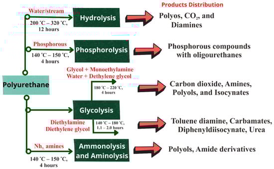 Polyurethanes (PUs) are essential materials, due to the thermoset and thermoplastic that can modify their chemical, thermal, and mechanical properties by reacting with polyisocyanates and polyols. The major polymers with urethane groups (–HN–COO–) are classified as PUs, regardless of the rest of the molecule []. In addition, the polyether polyols based on polyethylene oxide, PP, aliphatic polyester polyols, tetrahydrofuran, polycarbonate polyols, aromatic polyester polyols, polybutadiene polyols, and acrylic polyols are the most often used polyols in the manufacturing of PUs []. The thermochemical recycling of PUs includes alcoholysis, glycolysis, ammonolysis, and hydrolysis []. Figure 7 shows the alternative depolymerization routes for polyurethane waste.