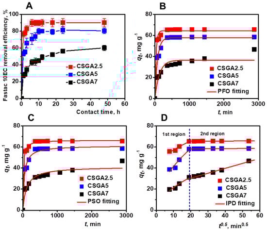 | PSO | qt,calc, mg g−1 | 66.48 ± 0.62 | 61.21 ± 1.24 | 41.37 ± 2.06 |