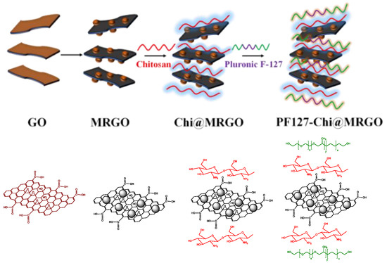 Co-precipitation is a straightforward method to synthesis nanomaterials structures. Co-precipitation reaction was used to develop magnetic nanoparticles that tethered on the surface of GO and reduced the GO simultaneously. Herein, Fe ion can react with oxygen-based functional groups to develop Fe3O4. This reaction might presence on the surface of GO since GO consist of abundance of oxygen-based functional groups, including carbonyl, carboxyl, epoxy and hydroxyl, thus resulting in MRGO. Moreover, PEG was used to enhance the compatibility of MRGO. Afterwards, we develop the surface modification of MRGO by using chitosan and PF127 to prepare Chi@MRGO and PF127-Chi@MRGO nanocomposites, respectively. Chitosan and PF-127 were used to enhance the biocompatibility of nanocomposites. Eventually, α-mangosteen was loaded into the PF127-Chi@MRGO. In this respect, α-mangosteen could physically be entrapped on the nanocomposites compartment. The schematic diagram of nanocomposite formation is provided in Figure 1.