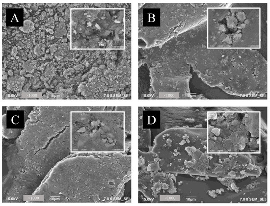 FE-SEM images of MRGO (A); Chi@MRGO (B); PF127-Chi@MRGO (C); α-mangosteen -loaded PF127-Chi@MRGO nanocomposites (D).