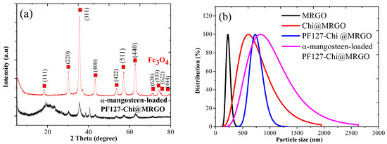 XRD was used to analyze the structure of nanocomposites. Figure 3a shows that the observed diffraction peaks indicate the GO with a diffraction peak at 2θ = 9.44 indexed as the (002) of GO, corresponding to a GO interlayer spacing distance of 0.67 nm, much larger than that of pristine graphite (0.34 nm); and this is caused by loosely stacked GO, due to the abundance of oxygen-based groups and defects caused by the acid oxidation on the surface of GO. The red line in Figure 3a shows that the observed diffraction peaks indicate the magnetite (Fe3O4) formation with the main peaks at 2θ of 18.29 (111), 30.11 (220), 35.48 (311), 36.49 (222), 43.15 (400), 53.71 (422), 57.1 (511), 62.8 (440), 71.19 (620), 74.40 (533), 75.16 (622), and 79.12 (444). The black line in Figure 3a shows the XRD spectra of α-mangosteen -loaded PF127-Chi@MRGO. These spectra indicated that GO was partially reduced, as confirmed by the strong diffraction 2θ = 20.54. A minor peak around 20.88° corresponds to the peak of chitosan and PF127 [34,35]. Whilst the peaks around 37° and 42° correspond to the rGO peak [33]. The remaining diffraction peaks in Figure 3a are all assigned to the crystal planes of cubic Fe3O4 (JCPDS 75-0033), indicating that the Fe2+ and Fe3+ precursors absorbed on GO were in situ reduced to crystalline Fe3O4 nanoparticles which were dispersed on the RGO surface. Furthermore, we calculated by using the Scherrer formula that the average size of Fe3O4 in α-mangosteen-loaded PF127-Chi@MRGO to be around 45 nm. We observed the absence of any other phase in XRD spectra indicating the good purity of magnetic nanoparticles on the surface of RGO.