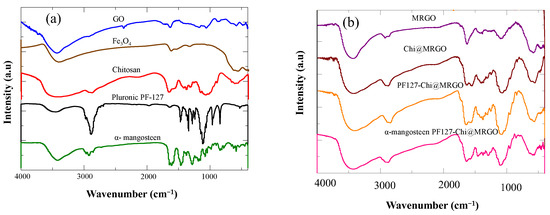 FTIR spectra of GO, Fe3O4, Chitosan, PF127, and α-mangosteen (a); FTIR spectra of MRGO, Chi@MRGO, PF127-Chi@MRGO, and α-mangosteen-loaded PF127-Chi@MRGO nanocomposites (b).