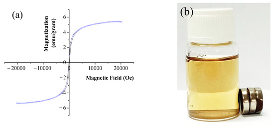 VSM of the α-mangosteen-loaded PF127-Chi@MRGO nanocomposites (a); the nanocomposites under magnetic field exposure (b).