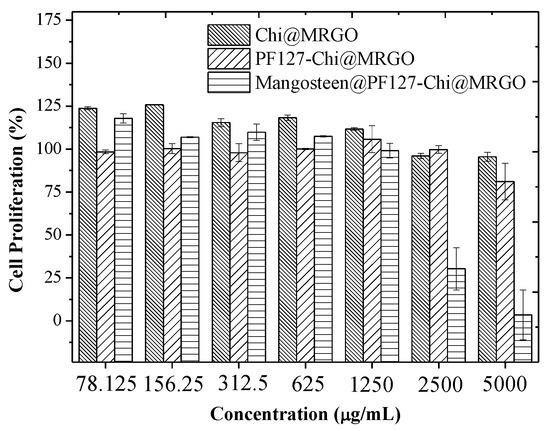Compatibility and safety issue plays a crucial role in discovery and development of nanocomposites for drug carrier agent. In vitro cytotoxicity assay of drug carrier including Chi@MRGO, PF127-Chi@MRGO and α-mangosteen-loaded PF127-Chi@MRGO was evaluated at a various concentration range from 78.125 μg mL−1 until 5000 μg mL−1 through a resazurin-based cytotoxicity assay against MCF-7 cell lines (Figure 8).