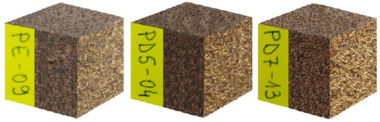 For the compressive test, using the same components, three bars with a square section were cast, with the side of the section measuring 21 mm. The mass proportion of chopped wheat straw was: 42% for the epoxy resin bar, 42% for the D5 hybrid resin bar and 41% for the D7 hybrid resin bar. The densities of the materials obtained were: g/cm for the epoxy resin bar, g/cm for the D5 hybrid resin bar and g/cm for the D7 hybrid resin bar. A total of 15 cubes were cut from each bar (using a disk flow machine) in accordance with ASTM D3410/D3410 M ([68]). These were abbreviated as follows: PE.1-15 composite specimens with epoxy resin matrix, PD5.1-15 composite specimens with hybrid resin matrix D5 and PD7.1-15 those made of resin matrix composite hybrid D7 (see Figure 2).