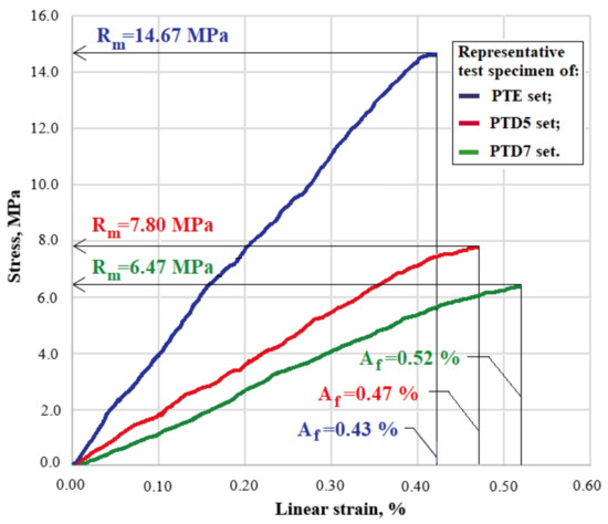 The characteristic curve was obtained by determining the modulus of the elasticity, tensile strength and elongation percentage after breaking. Figure 5 shows the characteristic curves (strength–strain diagrams) for representative specimens from the PTE, PTD5 and PTD7 sets.