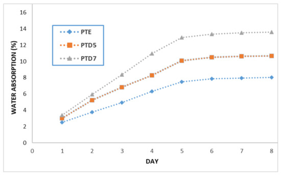 Variation of water absorption in percentage of PTE, PTD5 and PTD7 specimens.