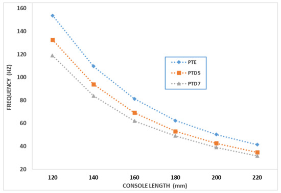 Variation of the vibration frequency as a function of the length of the bar console, for representative specimens from the PTE, PTD5 and PTD7 sets.