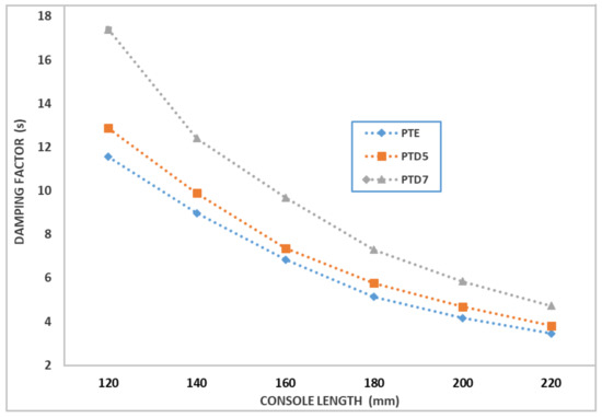 Variation of the damping factor according to the console length of the bar, for representative specimens from the PTE, PTD5 and PTD7 sets.