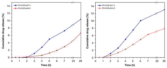 The in vitro release profiles of curcumin from the P3- and P5 complexes were determined at pH 7.4, the plasma pH, and at pH 4.5, the pH of the intracellular environment. In all instances, the release curves (Figure 2) showed an induction period of approximately 2 h for the P3-curcumin complexes and of approximately 1 h for the P5 ones. The absence of any burst effect and the delay observed in curcumin release suggested that the drug molecules are stably encapsulated in the core of the P3- and P5 complexes, and not simply adsorbed on the outer surface, and let preliminarily envisage a diffusion-controlled release mechanism.