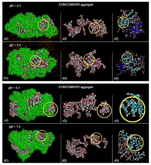 Optimized geometries of the curcumin/P3 aggregates at the end of MD run at pH 4.5 (a1–a3) and at pH 7.4 (b1–b3), and of the curcumin/P5 aggregates at pH 4.5 (c1–c3) and at pH 7.4 (d1–d3). On the left-hand panels (a1,b1,c1,d1) the atoms of P3 and P5 are all colored in green. In the same panels, the color codes of the curcumin molecules are as follows: carbon, grey; oxygen, red; hydrogen, white. For clarity, the carbon atoms of P3 and P5 are not shown in the mid panels (a2,b2,c2,d2). In order to provide a clearer picture of the π–π interaction among curcumin molecules, the sticks and balls structures of all aggregates are shown on the right-hand panels (a3,b3,c3,d3).
