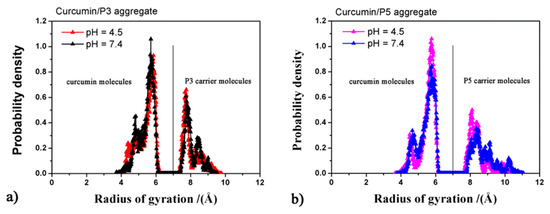 The conformation of all curcumin and P3 or P5 molecules in the aggregates were further analyzed by calculating the distribution of their radii of gyration (Rg) during the MD runs for all saved frames (Figure 5). As regards curcumin, elongated conformations (Rg ≅ 5.70 Å) were frequently observed, whereas more compact conformations (Rg ≅ 4.5 Å), likely due to the folding inducing π–π interactions of the aromatic rings, were less frequently detected. The radius of gyration of the P3 molecules range from 7.3 to 9.7 Å, whereas those of P5 exhibit slightly larger values, from 7.5 to 11 Å. The solvent accessible surface area of the P3- or P5-curcumin aggregates featured a similar and less extended surface area at pH 4.5 (Table 5) with respect to those observed at pH 7.4. The higher accessibility of the curcumin aggregates at physiological pH can explain the faster release observed at this pH (Table 5).