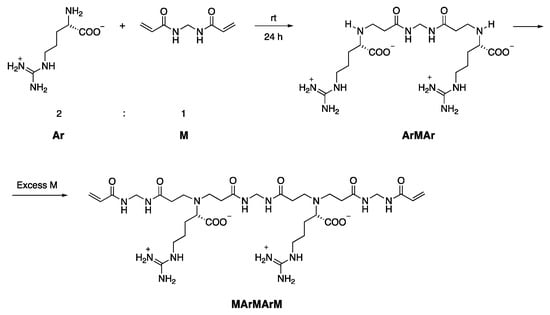 MArM and MArMArM were, in turn, obtained as previously described through the controlled polyaddition reaction of N,N′-methylene-bis-acrylamide with L-arginine (Scheme 2 and Scheme 3) [30].