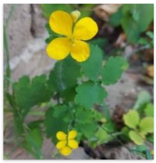 Celandine (Chelidonium majus L.) is a short-lived hemicryptophyte with a stem length of up to 1 m and is an important medicinal herb used in traditional and folk medicine []. Chelidonium majus is used for internal and external administration as botanical preparation (extracts, cataplasms) for more than 2000 years, and their benefits for health were first recorded in Antiquity by Dioscorides []. Important anti-viral, anti-microbial, anti-inflammatory, and analgesic effects have been observed and sustained by traditional medicine and, to correlate the chemical composition of Chelidonium species with medical applications, the therapeutic effects have been extensively studied in recent decades [,].