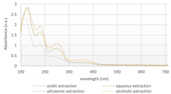 The extracted solutions were characterized using UV–Visible spectrophotometry. The UV-Vis spectra of the solutions at wavelengths from 200 to 800 nm are shown in Figure 5.