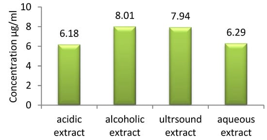 The total polyphenol content of the celandine extracts, expressed as gallic acid mg/100 mL, is graphically presented in Figure 6.