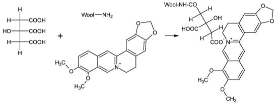 Among natural dyes, only alkaloid dyes act as basic dyes, in which there is a grouping with a quaternary nitrogen atom (>N+-). The nitrogen atom from alkaloids is positively charged and can bind to carboxylic groups from wool fibers []. With slightly acidic pH, and especially at neutral pH, berberine can partially bind to various substances as a basic dye (Figure 8). Naturally, at acidic pH, berberine dye solubility is significantly increased []. Citric acid facilitates the formation of crosslinks with wool polypeptide chains, and is capable of forming amide linkage with the -NH2 groups of wool (Figure 9) []. The chemical change caused by the UV treatment is due to surface oxidation of cysteine (disulfide bonds) and induces changes in the dyeing properties of the wool (due to the increased diffusion coefficient of the dyes in the treated wool fibers) [].