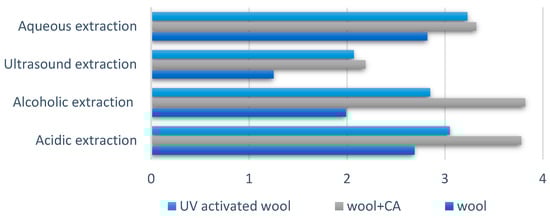 After testing the antimicrobial activity of the wool samples, it can be seen that the results were influenced by both the type of treatment of the wool fibers and the type of extract used (Figure 17).