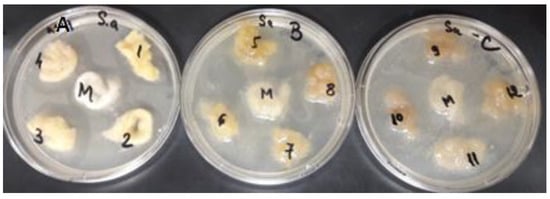 Antimicrobial activity of wool samples against Staphylococcus aureus ATCC 25923: A—wool samples treated with citric acid; B—UV-irradiated wool samples; C—untreated wool samples; 1—wool dyed with aqueous extract, 2—wool dyed with ultrasonic extract; 3—wool dyed with alcohol extract; 4—wool dyed with acid extract, M—control.