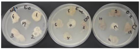 Antimicrobial activity of wool samples against Escherichia coli ATCC 25922: A—wool samples treated with citric acid; B—UV-irradiated wool samples; C—untreated wool samples; 1—wool dyed with aqueous extract, 2—wool dyed with ultrasonic extract; 3—wool dyed with alcohol extract; 4—wool dyed with acid extract, M—control.