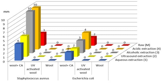 Comparing the results obtained with the inhibition zones of the controls (citric acid-treated and undyed wool fibers) for both Staphylococcus aureus (3 mm) and Escherichia coli (2 mm), it can be seen that the antimicrobial effect is potentiated by the bioactive compounds from the plant extracts with which the samples were dyed.